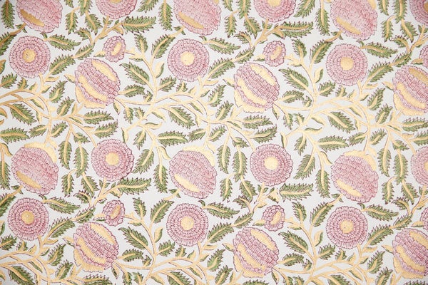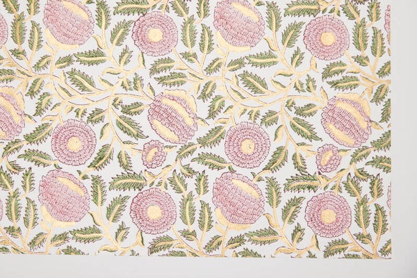 A separate wooden block is used for each colour application. Symmetry forms the core of the design and pattern repeats must be perfectly balanced. The colours are stamped one at a time and a high level of skill and precision is required to produce every sheet.