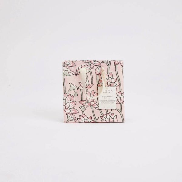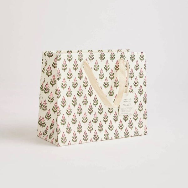 Our hand block printed gift bags are made from a strong 250gsm recycled cotton card paper in colours and designs complementing the gift wrap range. The bags are block printed using traditional techniques, and are not digitally mass produced. The cotton rope handles enhance the artisanal look of the bags and the matching swing tag carries a short blurb about the story behind the bags. Sold in a multi design pack of 6 bags (i.e. 3 designs x 2units per pack), offering the retailer more variety per pack.