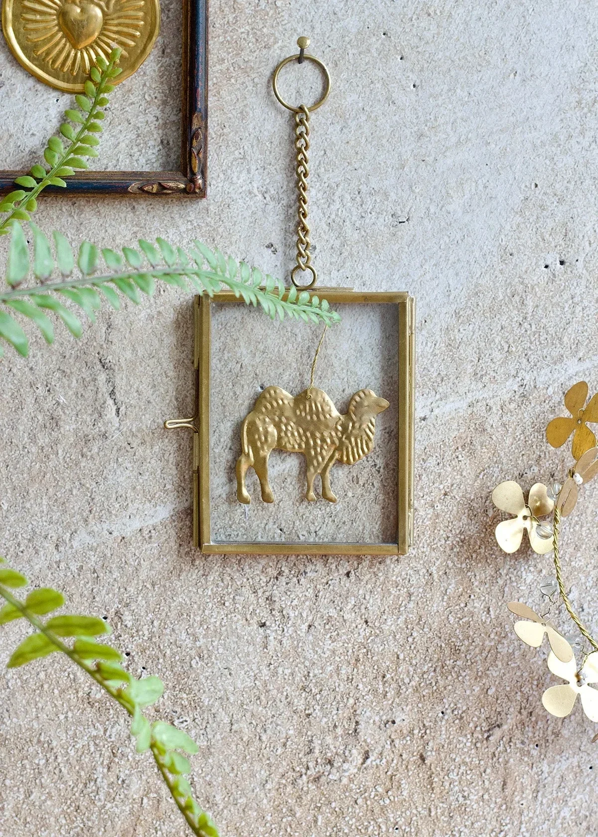Dit kleine, handgemaakte hanglijstje van messing is een subtiele manier om je meest dierbare herinneringen te presenteren. Gemaakt van messing met aan beide zijden heldere glazen panelen, wekt het de indruk dat je favoriete item in het lijstje zweeft. Het hangt aan een fijne messing ketting met een rond oogje, waardoor je het gemakkelijk kunt stylen aan de muur, in een raam of als onderdeel van een decoratief arrangement.